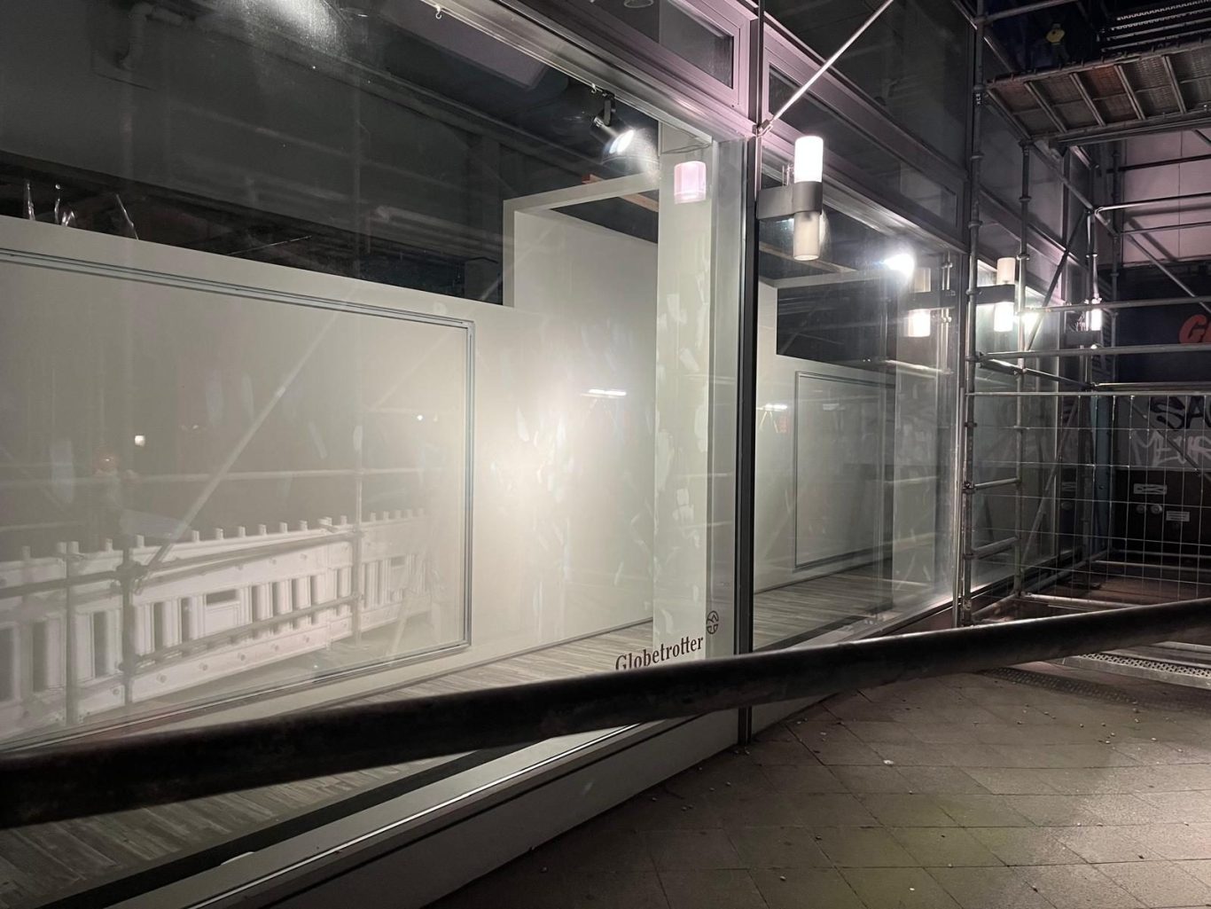 Inside, one may see a kind of triptych. Similar to an altarpiece, two large, empty metal frames flank a white wall. Brushstrokes remind of a construction site, though it is unclear if any real building activity is taking place. For passersby, nothing seems to be seen: no advertisements, no eye-catching displays. One might walk past without stopping to consider deeper questions.