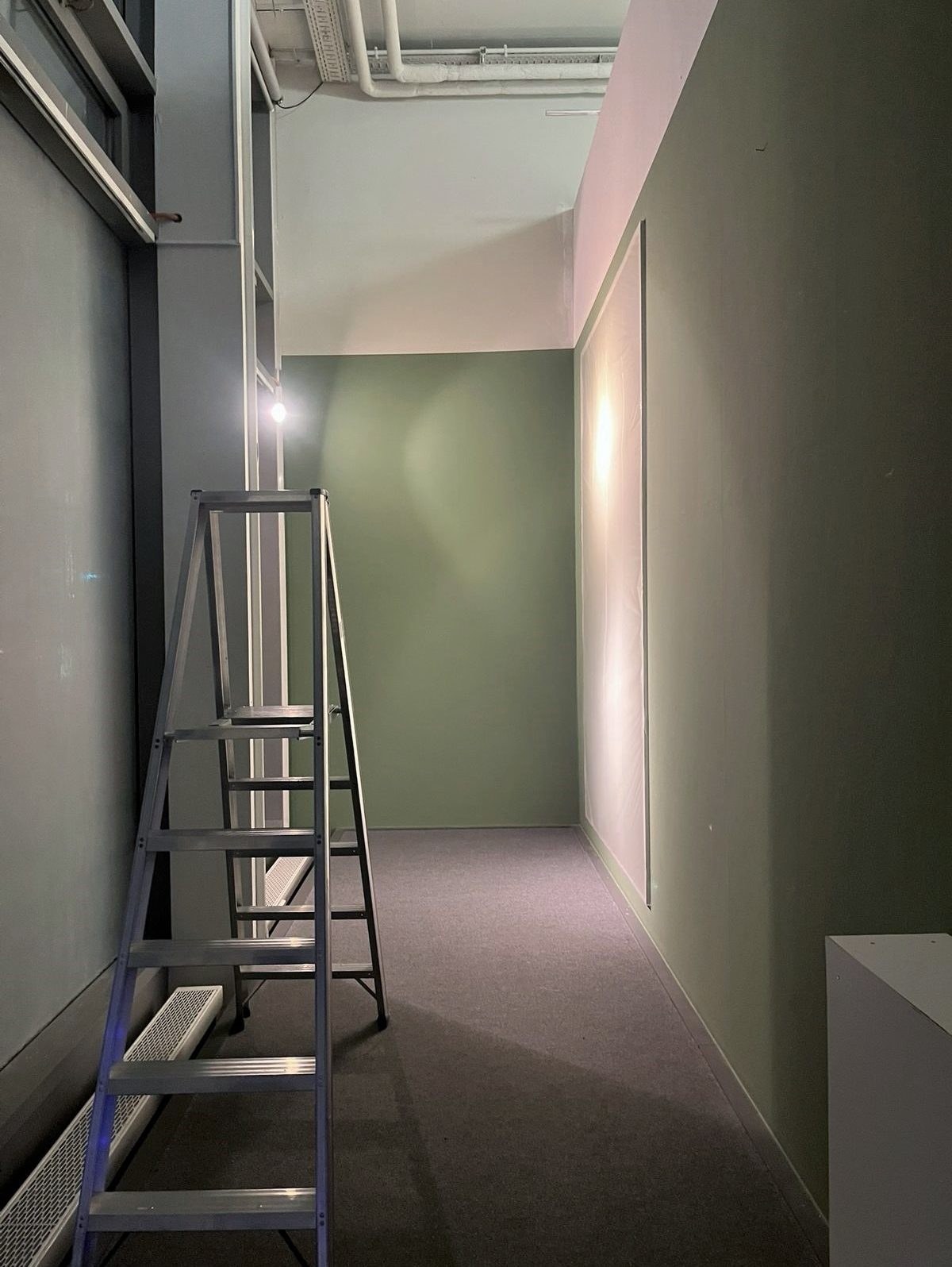 Die Reflexionen und Schattenwürfe auf der Kunststoffplane erinnern an digitale 3D-Modelle, die Materialität simulieren sollen. Es entsteht ein Farbspiel zwischen den unterschiedlich warmen Lichtern, der neblig-opaken Plane und den Wänden, die ehemals von einem Geschäft für Outdoorausrüstung pflanzenhaft-grün gestrichen wurden.